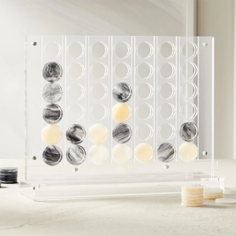 An elevated take on a classic game. Clear acrylic and beautiful marbleized resin pieces combine for a display-worthy look. Clear acrylic stopper keeps pieces in play and removes easily to clear the board at the end of the round. CB2 exclusive.