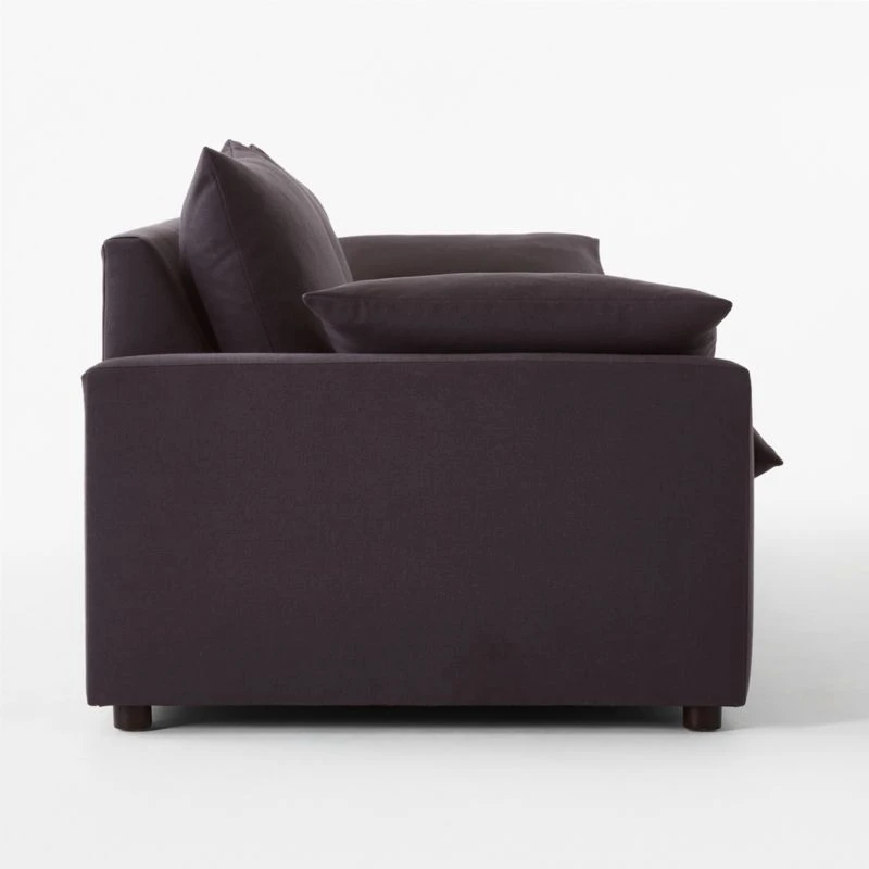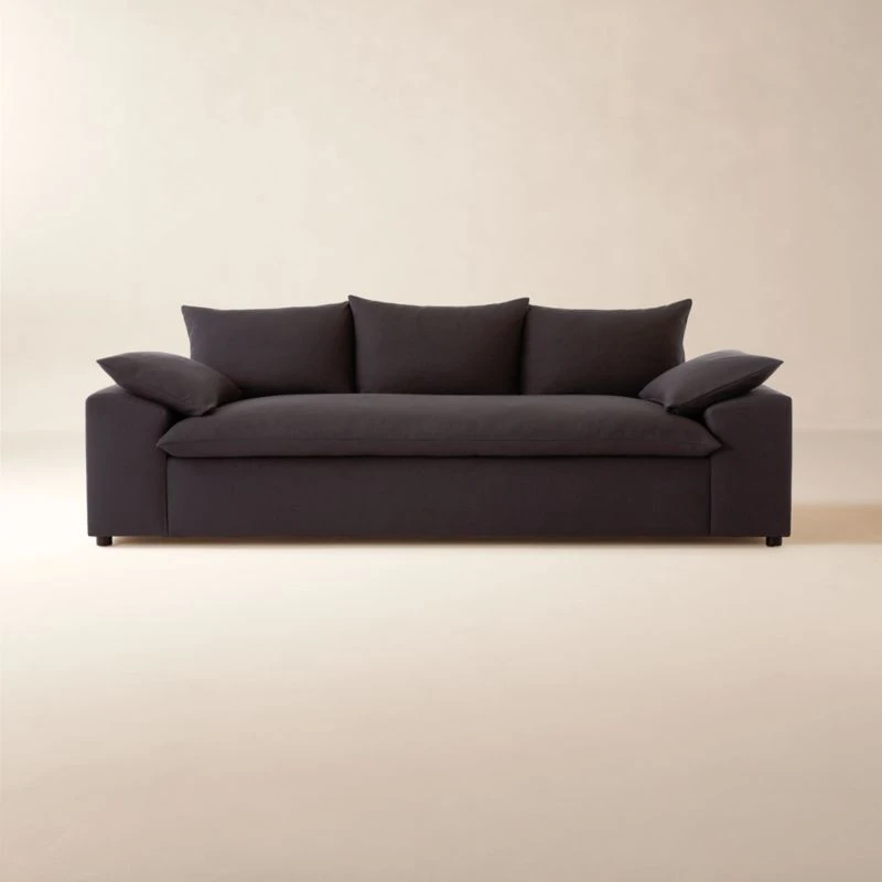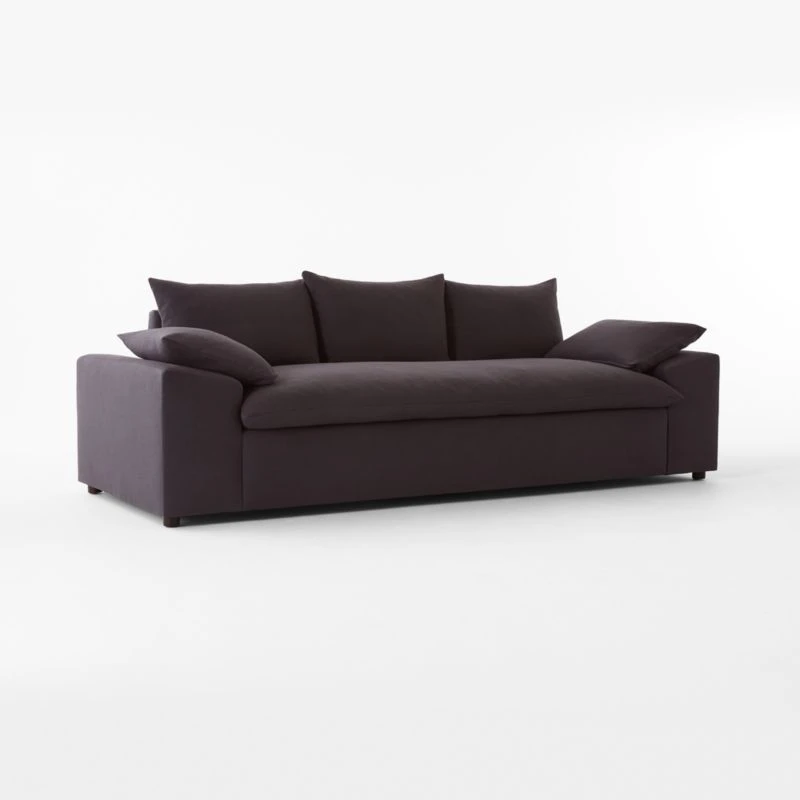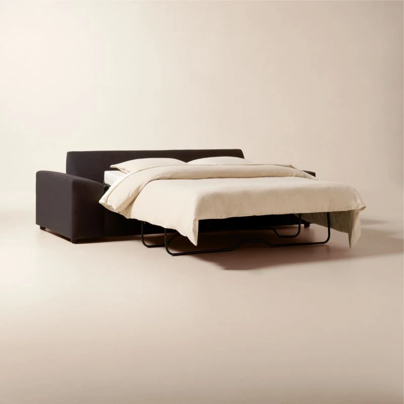 Designed by VUUE, sleeper sofa offers elevated comfort in a relaxed performance linen. The deep, loungy profile is contrasted by two angled arms that, when paired with the pillow-like cushions, make a perfect spot for an impromptu nap. Featuring a memory foam mattress, the sofa effortlessly stretches out to a queen bed for overnight guests. CB2 exclusive.