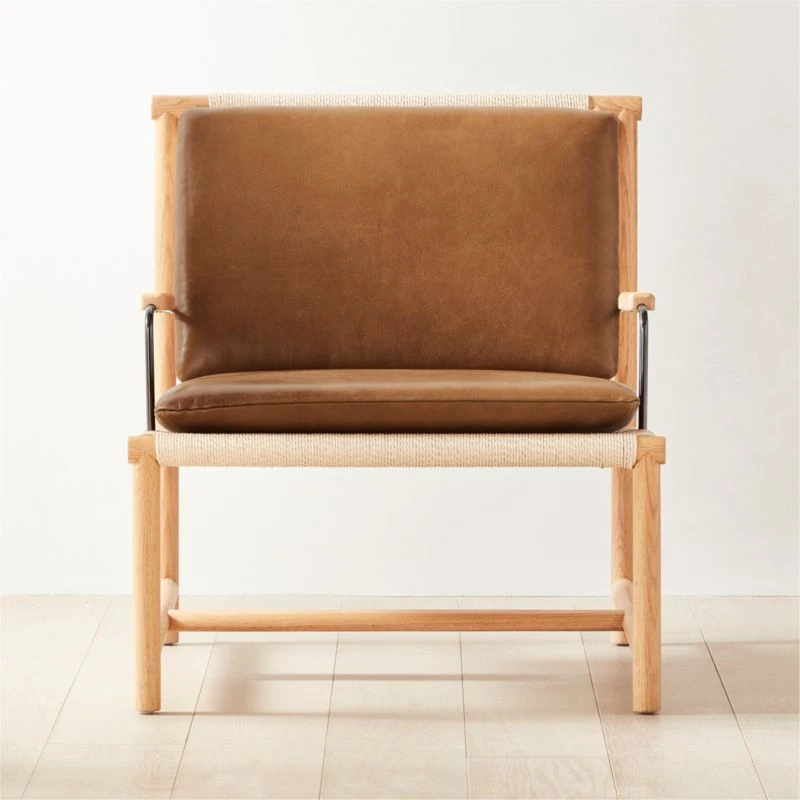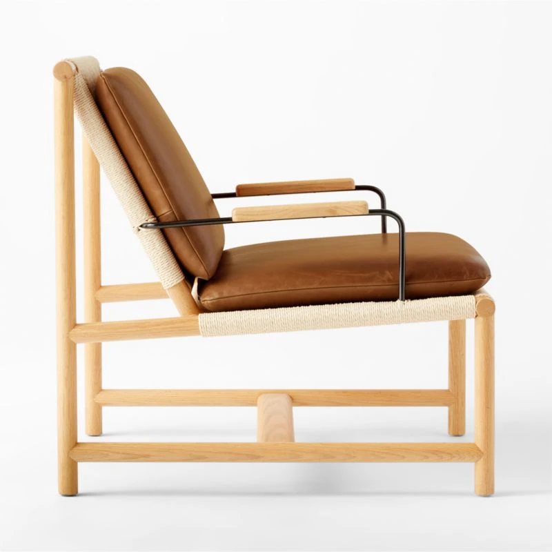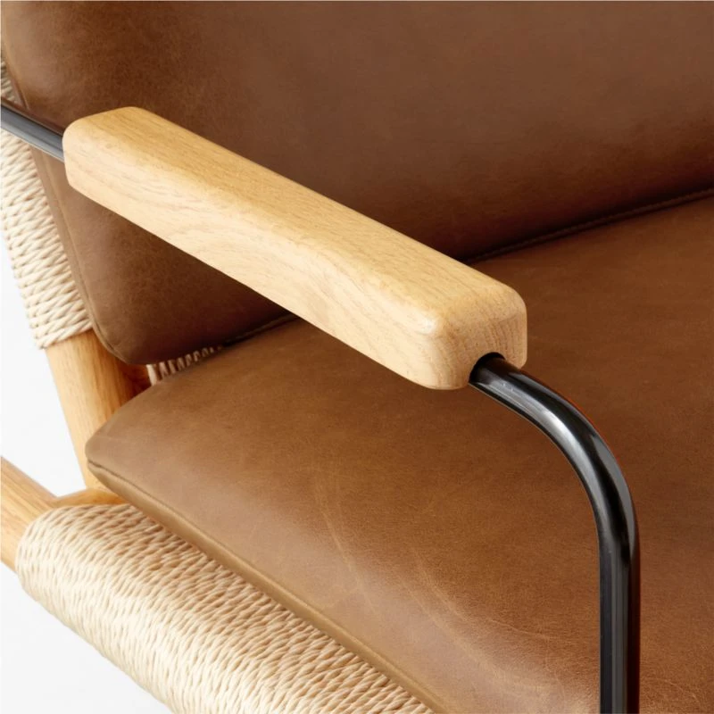 In exposing the structure of a lounge chair, design duo Lawson-Fenning reveals the details often overlooked. Oak frame, certified sustainable by the Forest Stewardship Council ®, has clean, considered joinery and gorgeous wood grain that contrasts with metal arms in blackened plated finish. The seat and backrest are woven of Danish paper cord, typically used in Scandinavian and midcentury furniture for its aesthetic and durability. Cushions are crafted with luxurious Moore & Giles saddle leather that will wear beautifully in the years ahead. CB2 exclusive.