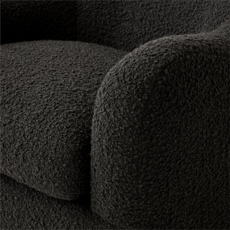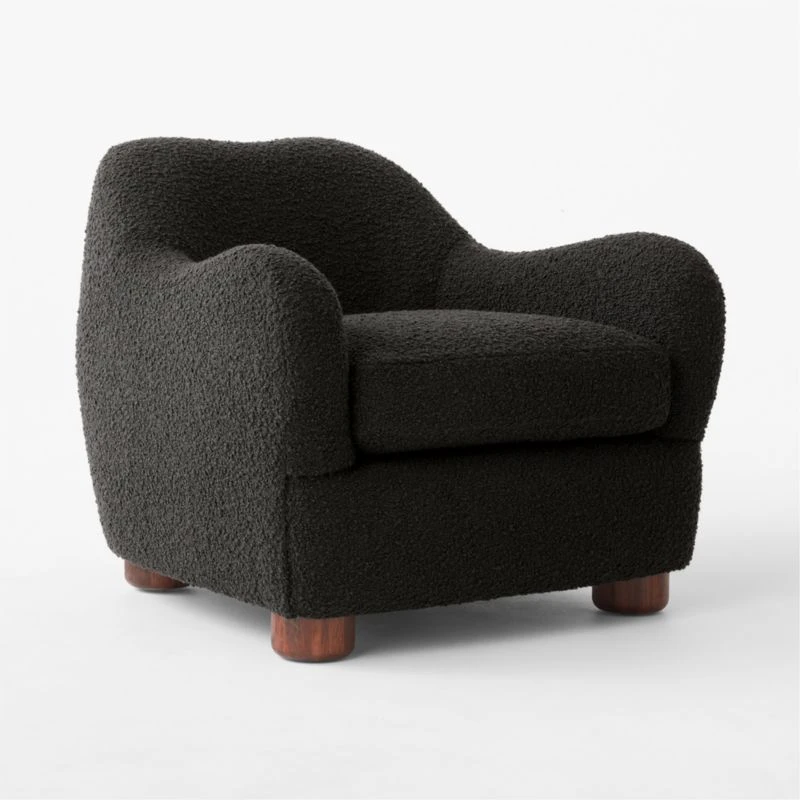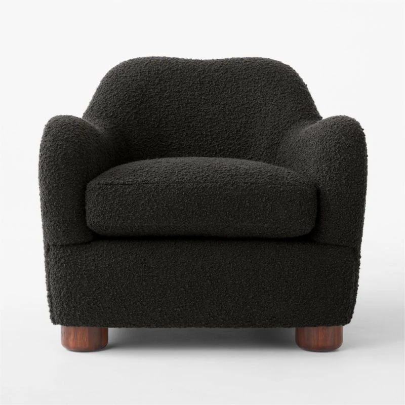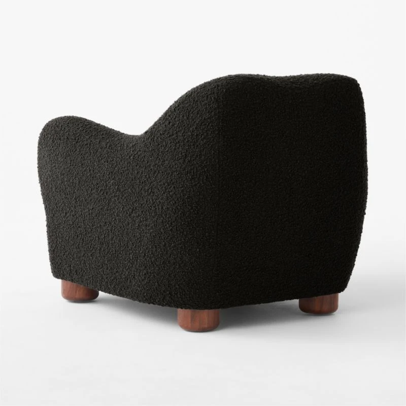 Boucle takes on a tonal black hue in the loungeable chair designed by Ross Cassidy. Bubbly and oversized in shape with a wooden frame certified sustainable by the Forest Stewardship Council ® (FSC) and rounded legs of solid walnut. CB2 exclusive.