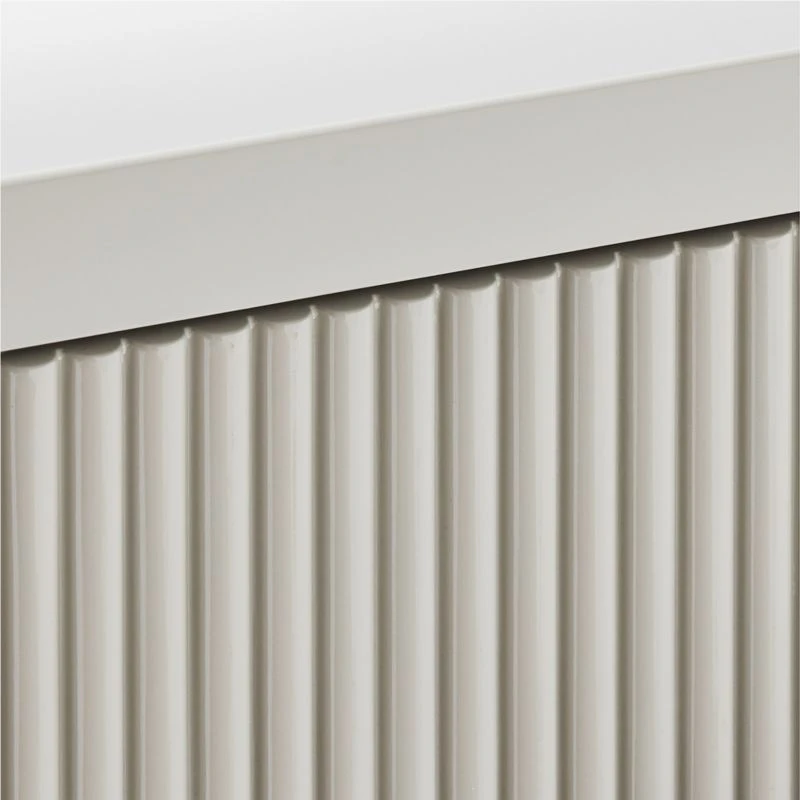 Designed by Brett Beldock, warm grey nightstand creates clean, sophisticated lines with a high-gloss lacquered finish. Channels of poplar wood certified sustainable by the Forest Stewardship Council ® front the single push-to-open drawer, adding a sculptural detail to complete the look. CB2 exclusive.