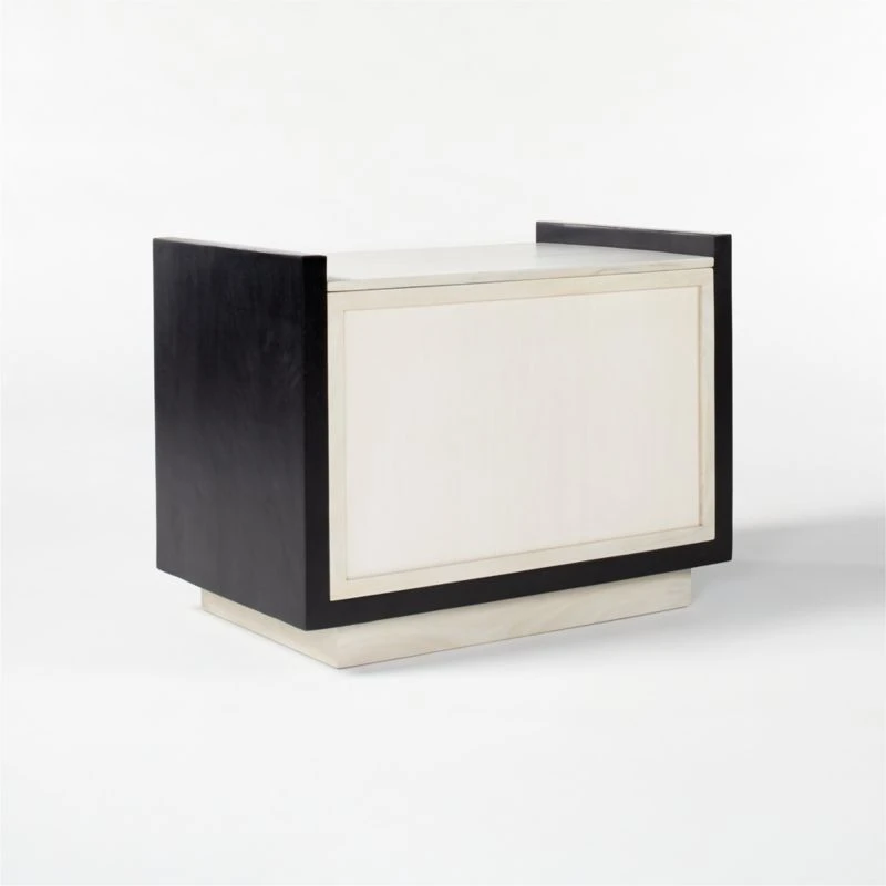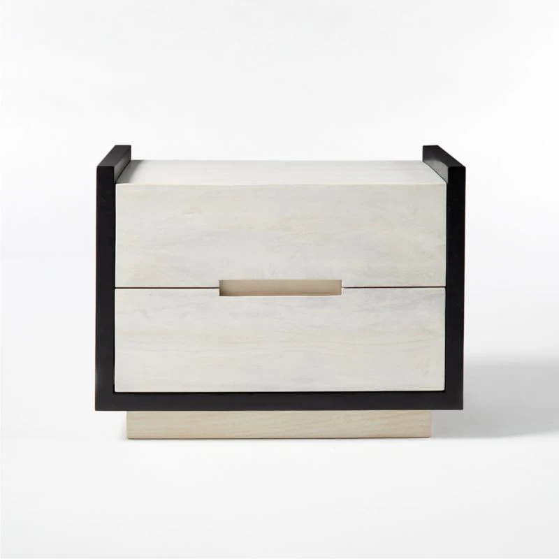 Designer Nicholas Obeid brings a graphic pop to the bedroom with this striking nightstand. Whitewashed solid acacia wood and base are framed in contrasting blackened mango wood. Two drawers provide ample storage. Learn about Nicholas Obeid on our blog. CB2 exclusive.