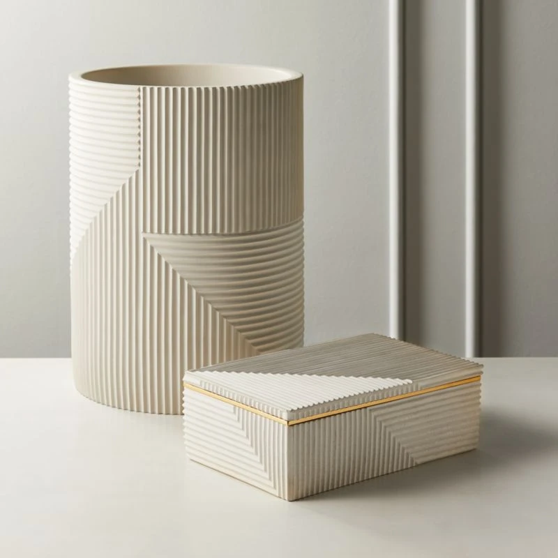 Vertical and horizontal lines cement a graphic design in this light grey decorative wastebasket. CB2 exclusive.