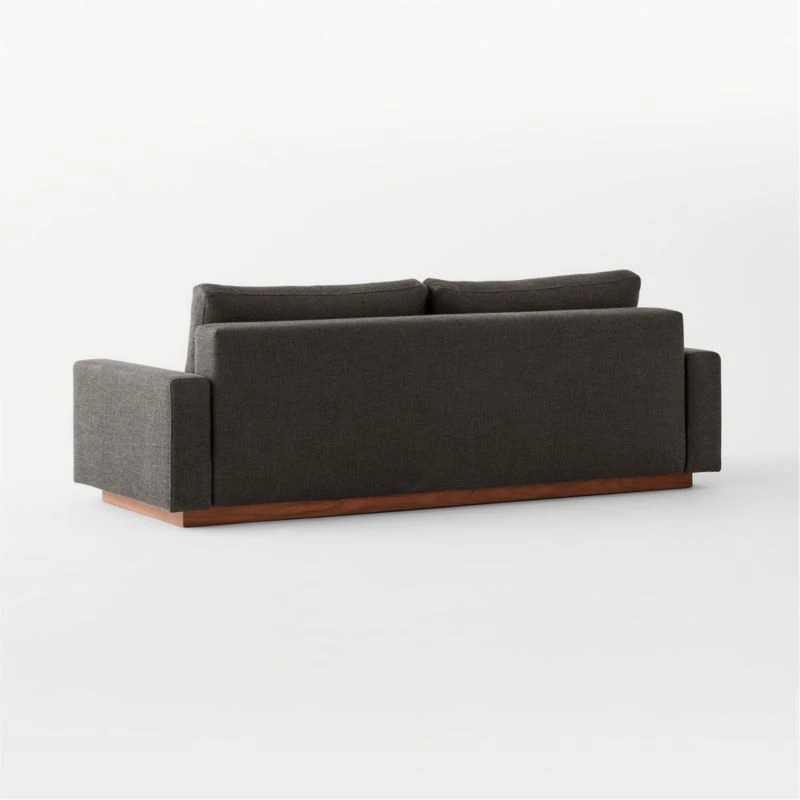 Tailored sofa in charcoal grey menswear-inspired fabric goes from day to night seamlessly. Remove the back cushions, pull up the seat and extend front legs from hidden zipper pockets underneath. Slide the seat forward and fold the back down. No need to pull away from the wall or unfold a heavy mattress. Neat feature: Full-length arms become the headboard and footboard. Sofa sleeps two comfortably. CB2 exclusive.
