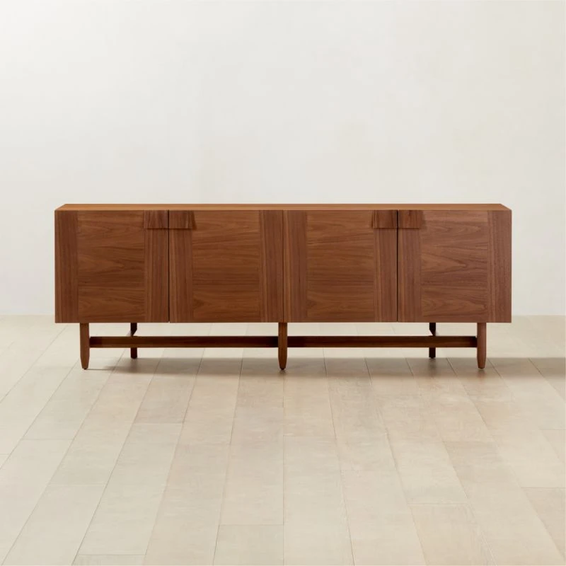 Handsome credenza by California design duo Lawson-Fenning plays up horizontal and vertical wood grain patterns to emphasize texture and dimension. Resting atop an airy base, the piece has integrated angular door handles. Four doors open to reveal generous storage, along with an adjustable shelf. CB2 exclusive.