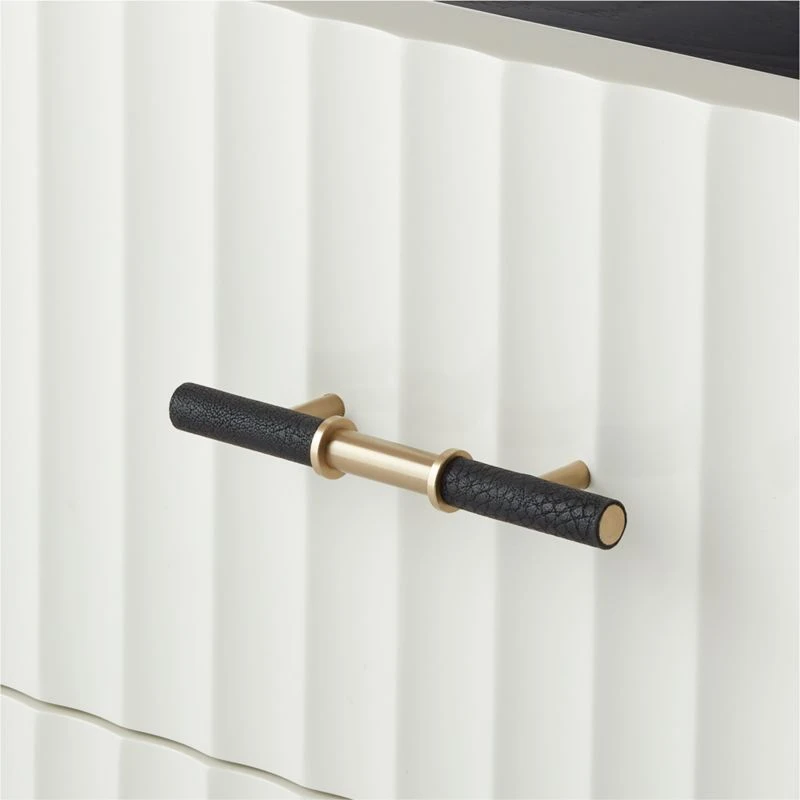 Ebonized oak frames this black and white Caleb Zipperer-designed nightstand in stark contrast. Two wavy hi-gloss white drawers tuck away necessities. Brass handles with black faux leather detail complete the elevated look. Learn more about Caleb Zipperer on our blog. CB2 exclusive.