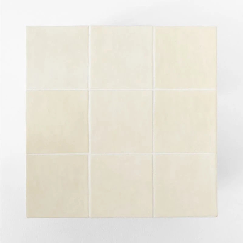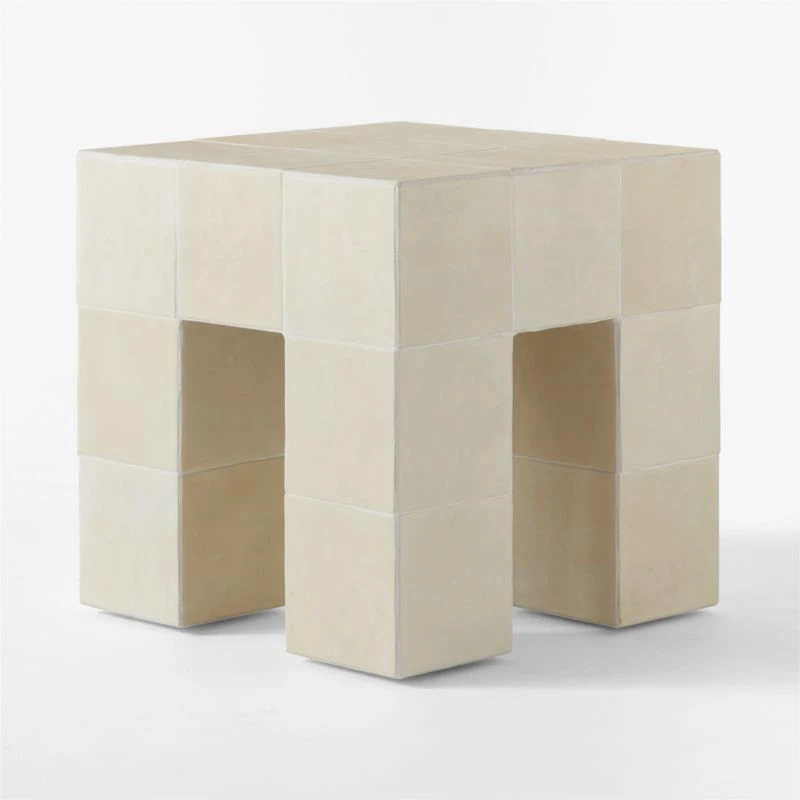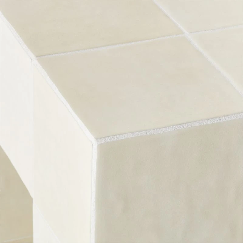 Hand-laid by skilled artisans, white ceramic tiles completely cover this modern outdoor accent table by VUUE. Tonal variations in the tiles form a high-low grid pattern that’s unique to each piece. CB2 exclusive.