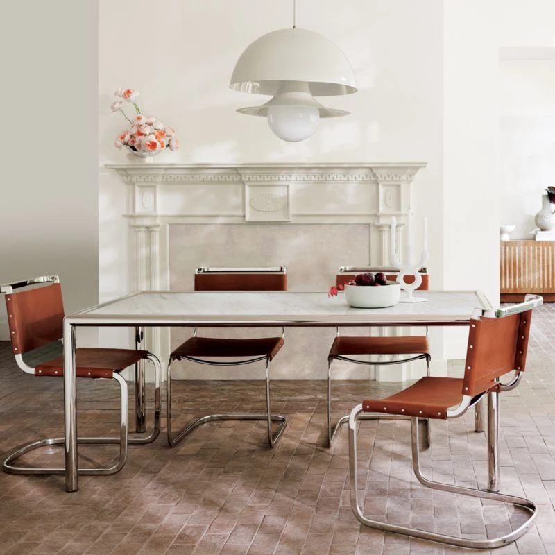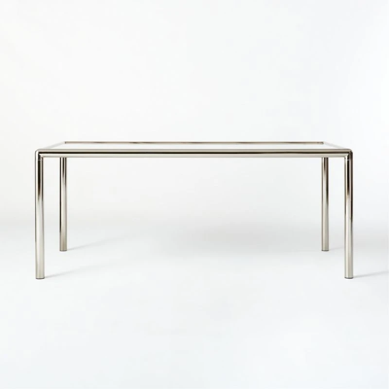 Organic marble top sits inside a polished nickel base for a minimalist dining table that keeps things simple but chic. We especially love it doubled as a desk/dining situation in smaller spaces. Easily converted, fits effortlessly with any style. CB2 exclusive.