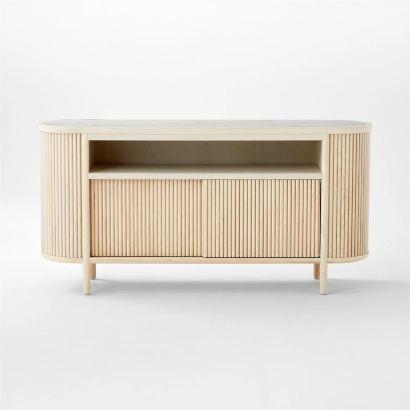 Stunning credenza features a volakas marble top and reeded wood detailing for added design edge. Uninterrupted by hardware, doors slide open to reveal adjustable shelves that offer versatile interior storage. Crafted from FSC ®-certified white washed ash wood, the piece works beautifully in the dining room, bedroom or entry. Because of its unique height, it also works fantastically as a bar or buffet. CB2 exclusive.