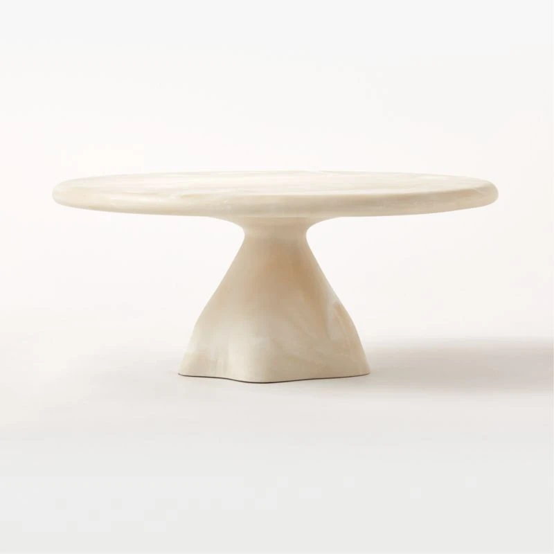 Sculptural coffee table from Brooklyn-based Caleb Zipperer updates the classic pedestal table with striking materiality and a modern biomorphic base. The organic silhouette is hand-poured and casted of matte resin with swirls of cream and ivory to resemble a richly veined marble. Perfectly scaled for smaller living spaces. CB2 exclusive.