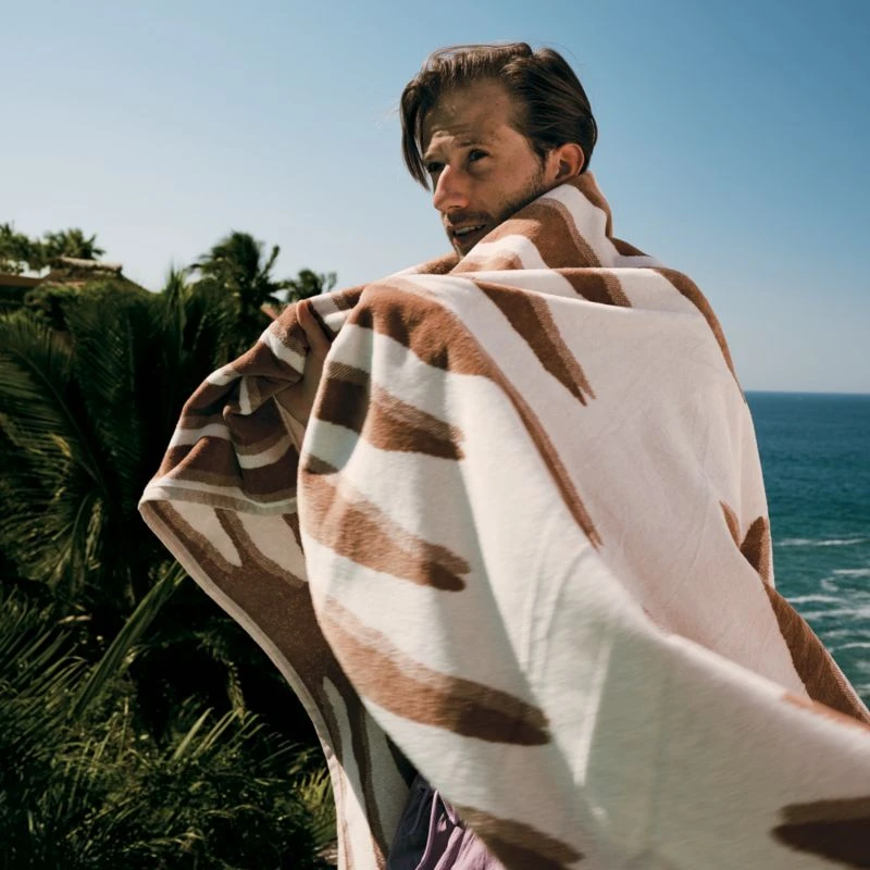 Thick, large beach towel by Ross Cassidy is adorned with bold feline stripes and warm neutral tones translated from his original artwork. Made in Portugal, home to some of the world’s finest textiles, pure organic cotton towel has a silky velour front and an absorbent terry cloth back that’s just right for afternoons by the pool. CB2 exclusive.