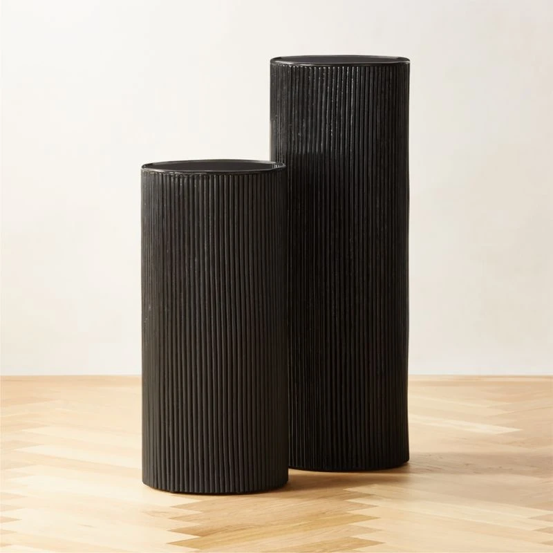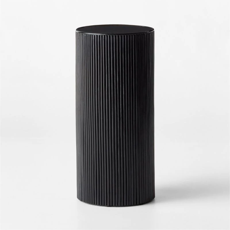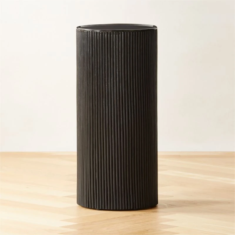 Black lacquered finish elevates Mermelada Estudio’s rattan pedestal table. Topped with a smooth, glossy black wood surface, its simplicity provides the perfect contrast ensuring sculptures, vases, plants and other objects of importance stand out. CB2 exclusive.