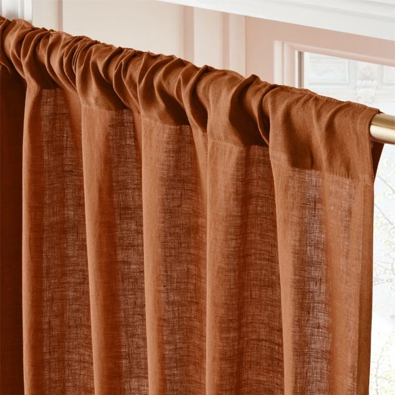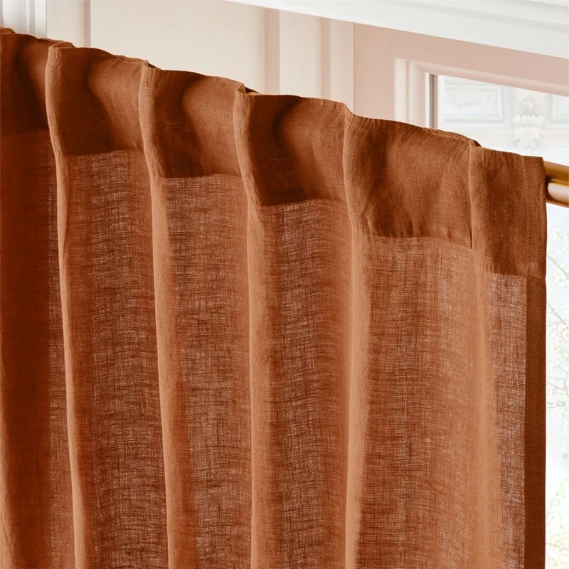 Light-filtering linen drapery is woven from natural flax grown in Europe. Full-length in glazed ginger. Hangs beautifully with back tabs, rod pocket or drapery hooks. CB2 exclusive.