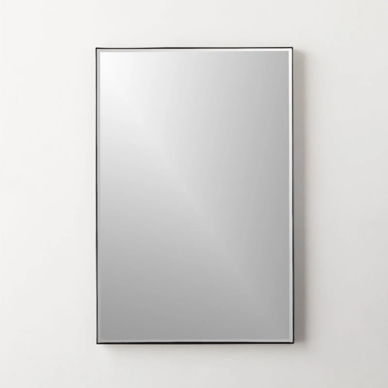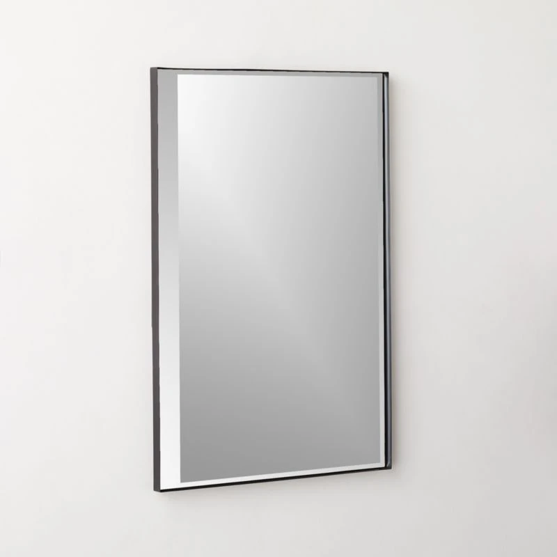 Beveled edges and brass line up in a handcrafted rectangular mirror that boasts both simplicity and depth. Solid brass is finished in matte black for an elevated look that hangs stunning above a vanity or as a goes-anywhere decor piece. Part of the Graduate mirror collection. CB2 exclusive.