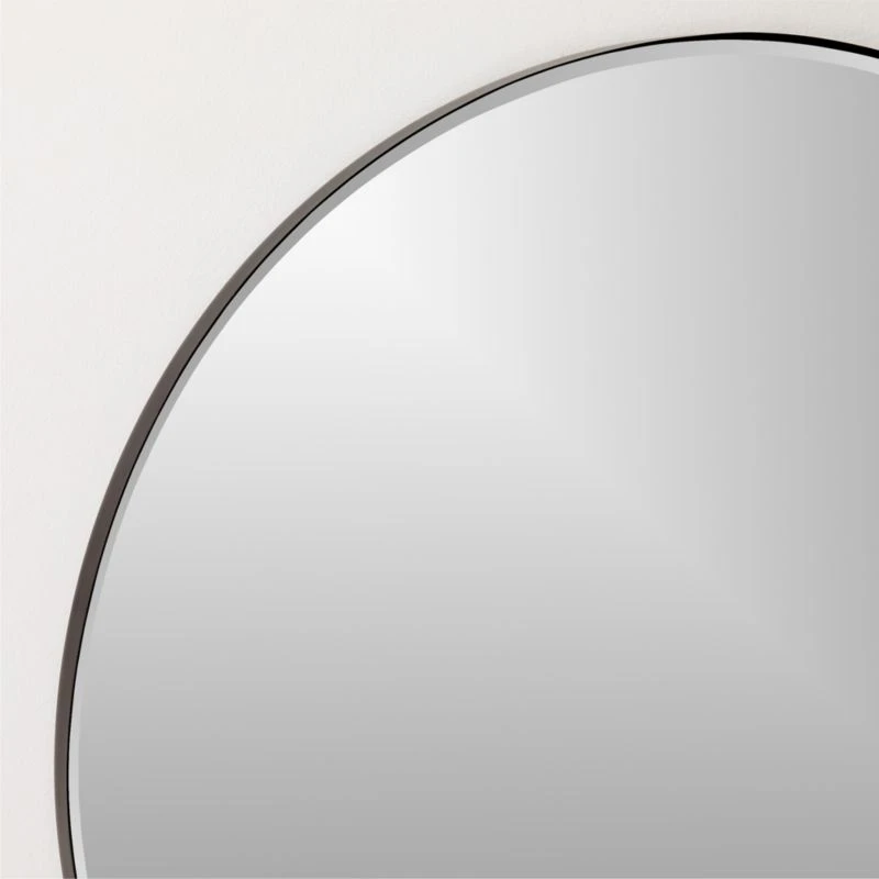 Beveled edges and brass round out in a circular handcrafted mirror that boasts both simplicity and depth. Solid brass is finished in matte black for an oversized look that hangs stunning above a vanity or as a goes-anywhere decor piece. Part of the Graduate mirror collection. CB2 exclusive.