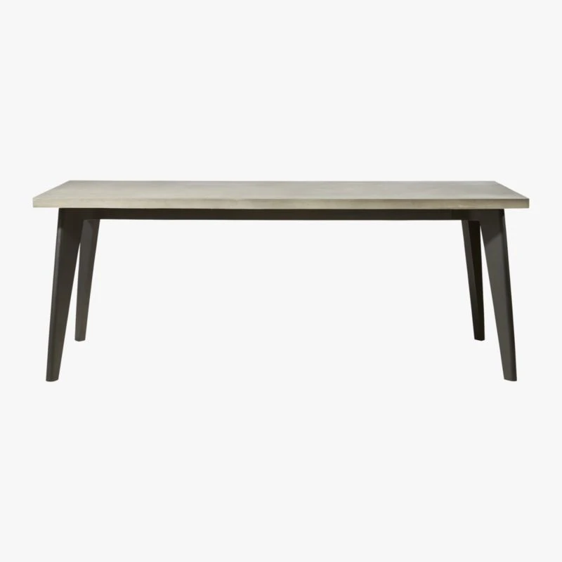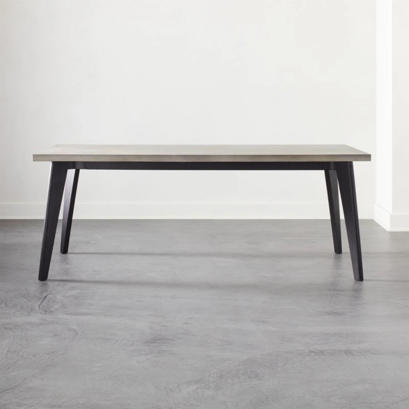 Designed by Mermelada Estudio, versatile table mixes modern materials for an industrial take on everyday dining. Black-finished steel sets a clean base with angled legs that taper to the feet. Paired here with a solid grey concrete top. Part of the mix and match collection, top or base can be swapped out for a whole new look. Learn about Mermelada Estudio on our blog. CB2 exclusive.
