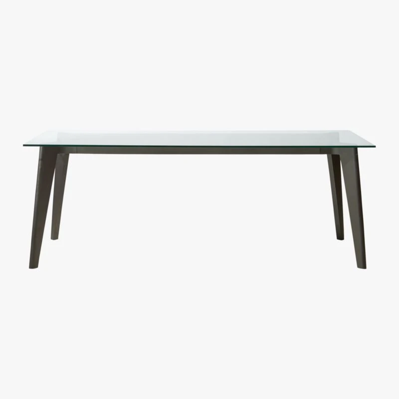 Mermelada Estudio takes a fresh look at everyday dining with this versatile, mixed-material table. Black-finished steel sets a graphic base with angular legs that taper down to the feet. Paired here with a clear, tempered glass top. Part of the mix and match collection, dining table top or base can be swapped out for a whole new look. Learn about Mermelada Estudio on our blog. CB2 exclusive.