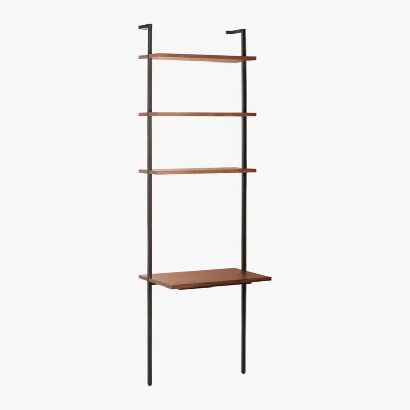Party on top, business on the bottom. Three fixed walnut veneer shelves pan out in a powdercoated metal frame. Modularly designed to pull double duty as a display/work space and looks even better standing next to our Helix walnut bookcase. Stud mounting recommended; hardware included for drywall installation. CB2 exclusive.