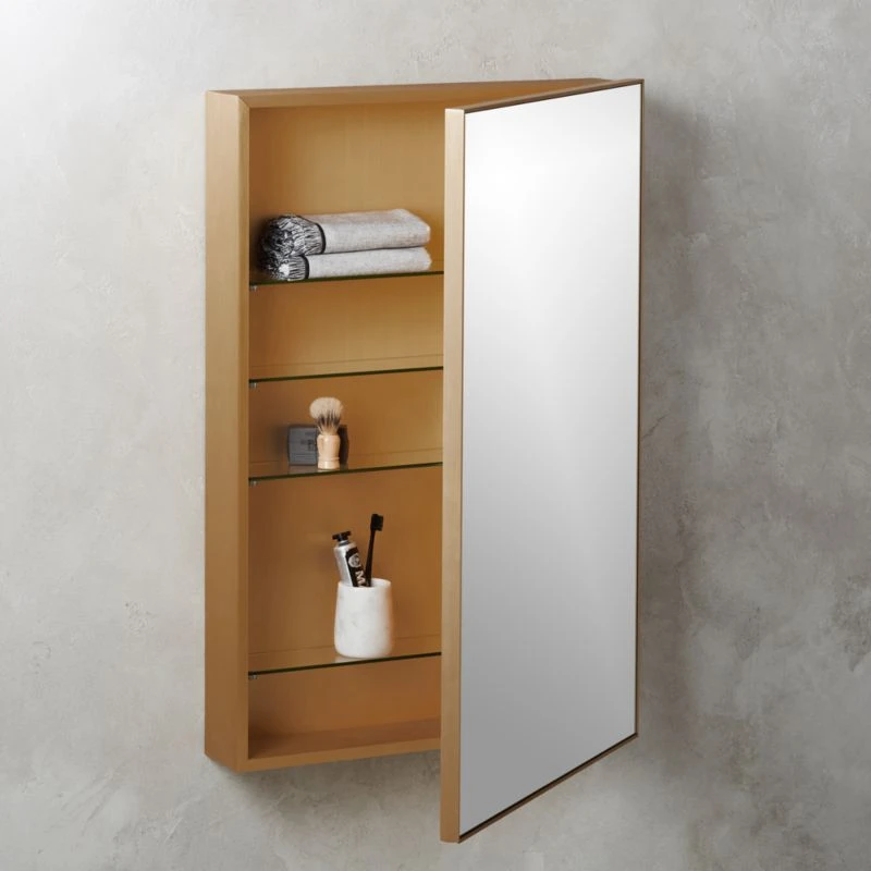Generously sized mirrored bath cabinet swings open to reveal three glass shelves for storing everyday bath essentials. Pure extruded aluminum frame with brushed brass plated finish resists corrosion to boot. Mounting hardware is included. CB2 exclusive.