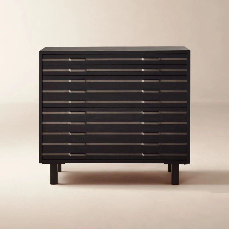 “Familiarity reigns and favorites are reimagined with a splash of LA cool and a fashion edge,” says Fred Segal of their eclectic approach to furniture design. Take this mixed-material file cabinet fronted with stripes of blackened nickel inlay. Inspired by vintage flat-file cabinets with tons of tiny drawers, our modern version has only four: two small, one medium and one large for hanging letter or legal files. CB2 exclusive.