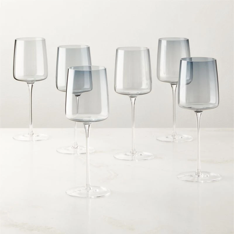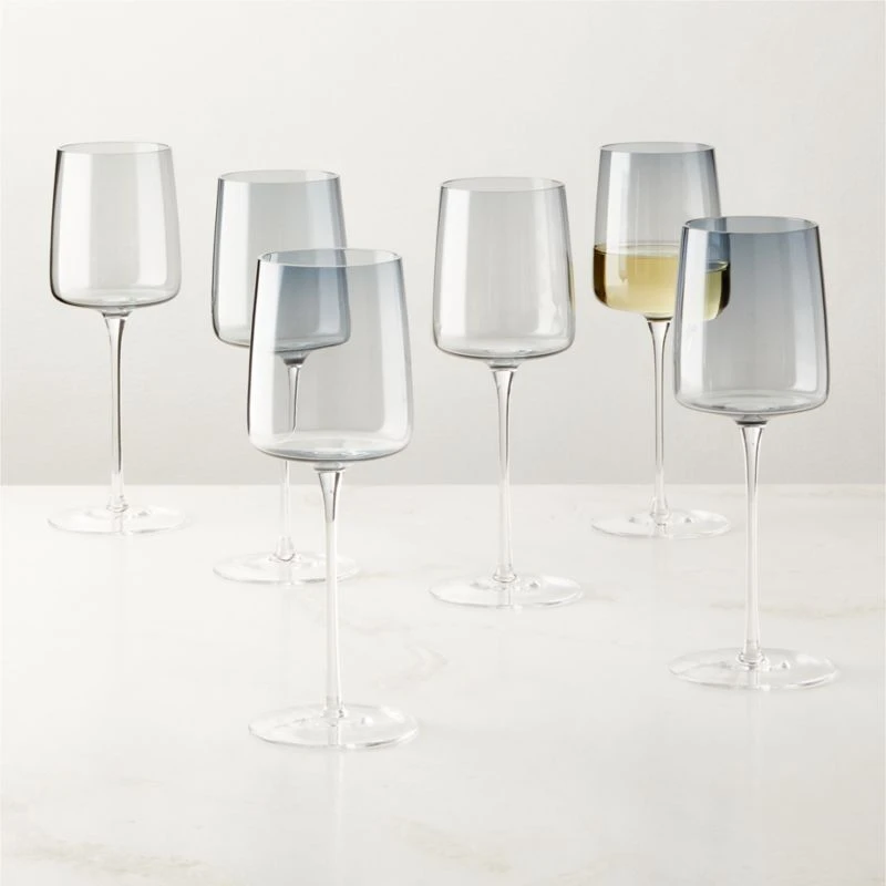 Handmade white wine glass with straight, elongated sides and soft round bowl detail offers bold sips from a fine, hand-polished rim. Set includes six midnight blue white wine glasses. CB2 exclusive.