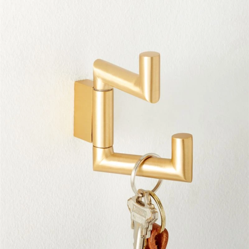 Mermelada Estudio mixes delicate design with solid brass construction in this sleek swivel hook. Finish adds a modern touch to the bath. Pair with the Kela knobs, handles, toilet paper holders and towel racks for a cohesive look. CB2 exclusive.