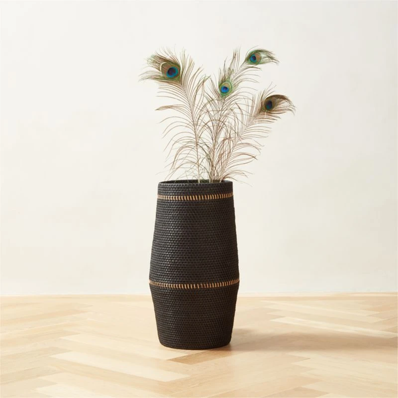 Woven rattan decorative basket adds a natural touch to any space. Style on the floor to hold tall stems. CB2 exclusive.