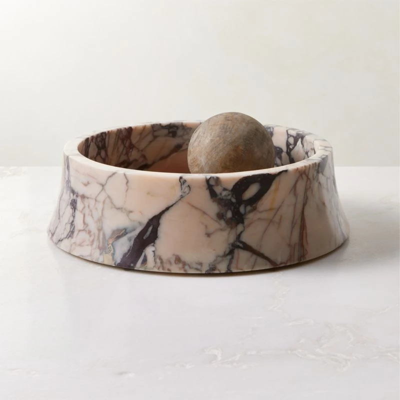 Expertly carved from a single piece of Purple Breccia marble, low bowl by Ross Cassidy is a beautiful focal point for the outdoor or indoor table. This warm-toned, highly active stone is sourced from Turkey, where it’s prized for its impressive variety in veining; accordingly, no two bowls will be alike. CB2 exclusive.