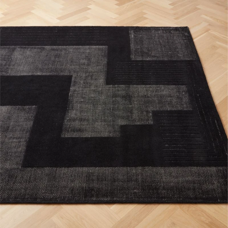 Sophisticated tonal graphic design starts with rug makers hand-looming the base of the rug, then overtufting the pile to create subtle layers of texture on the surface. A final distressing technique adds a vintage feel and gives each area rug unique highs and lows. CB2 exclusive.