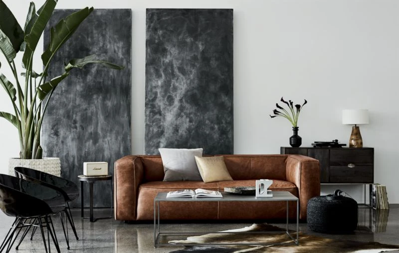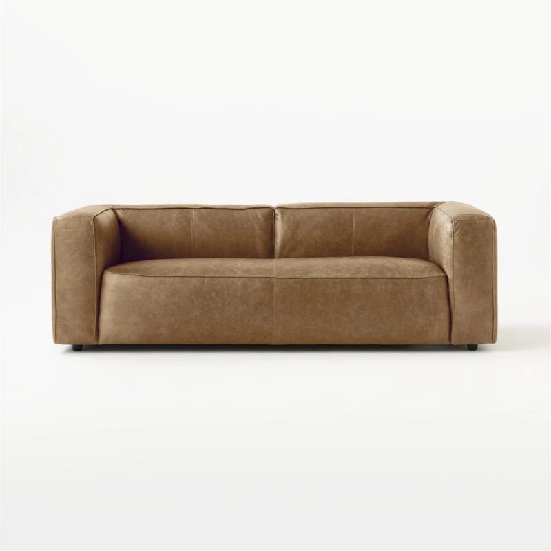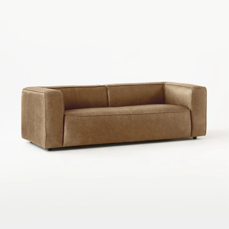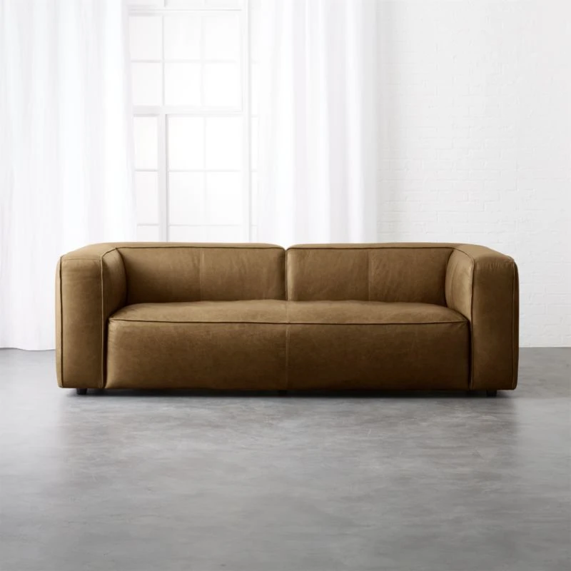 Everyone, chill: Designed by Mermelada Estudio, saddle brown leather sofa lounges ultra-low with overstuffed cushions that beckon for late-night hangs. Straightforward lines keep the focus on comfort/cool-factor. Learn more about Mermelada Estudio on our blog. CB2 exclusive.