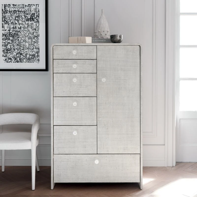 Designed by fashion-designer-turned-home-designer Brett Beldock, this sculptural chair brings a bit of sophistication to any space. Updating the traditional barrel chair design, Brett’s fresh take is more open and lighter in feeling. Upholstered in white performance fabric, dining chair stands up to dirt and stains. Learn about Brett Beldock on our blog. CB2 exclusive.