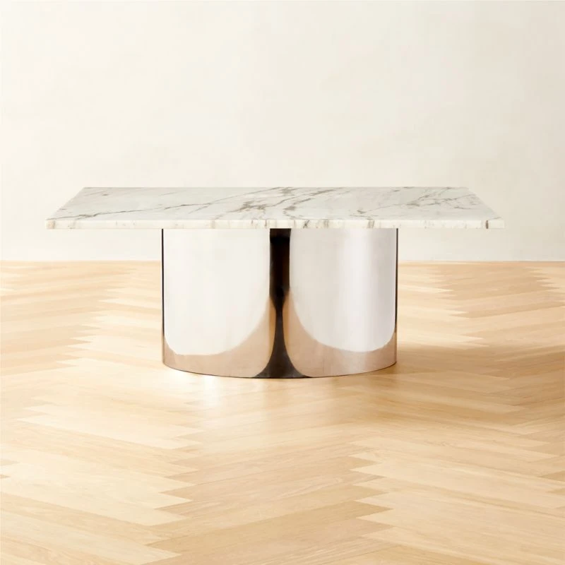 Mermelada Estudio’s ’70s Modernism inspired marble-topped table demands attention in any space. Set atop a tubular polished stainless steel base, the rectangular white river marble slab top adds a luxurious feel for a sophisticated tabletop. Due to the activity inherent to natural stone, each piece will be uniquely yours. CB2 exclusive.