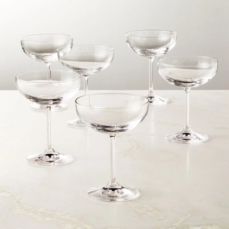 Delicate proportions and a clear-as-a-bell “clink” raise a glass to retro glamour. Taking shape with a broad, full bowl and shorter, more casual stem, this modern take on the classic coupe showcases sparkling cocktails—or anything you mix up. CB2 exclusive.