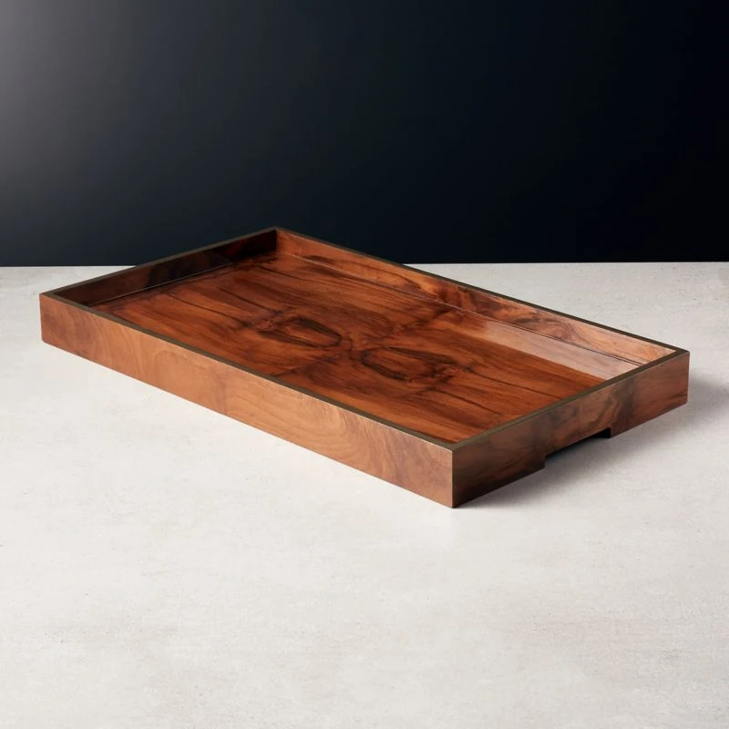 A deeper, darker take on our popular burl wood serving trays. Glossy burl wood lacquer is bordered in tonal brown for a design twist. Rectangular tray works to store and display necessities, while cutout handles underneath make for easy carrying. CB2 exclusive.