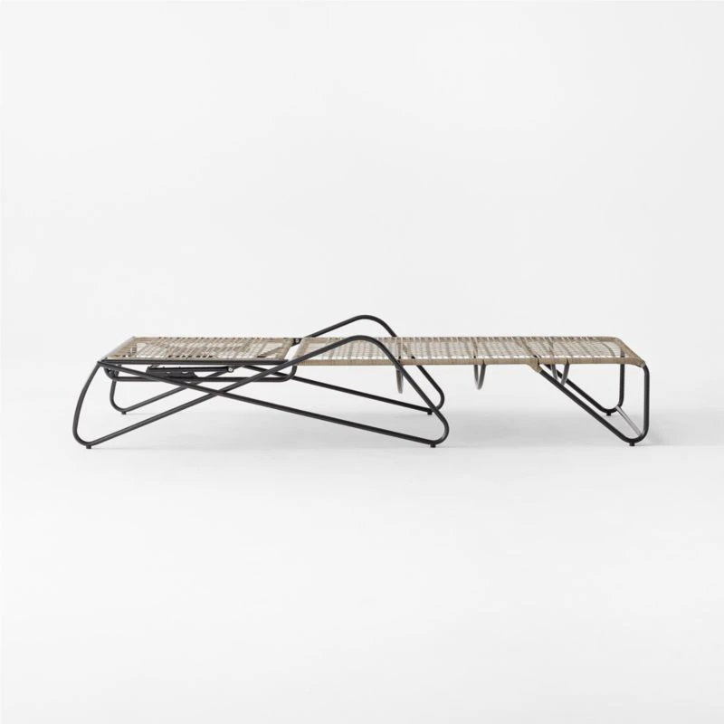 Sinuous sculptural chaise lounge by Brett Beldock is a nod to iconic midcentury outdoor designs made from iron tubing. Bold black lines flow from the arms to the base in winding iron. Paired with a tonal grey resin rattan seat and adjustable back, they create a modern chaise lounge made for relaxing. CB2 exclusive.