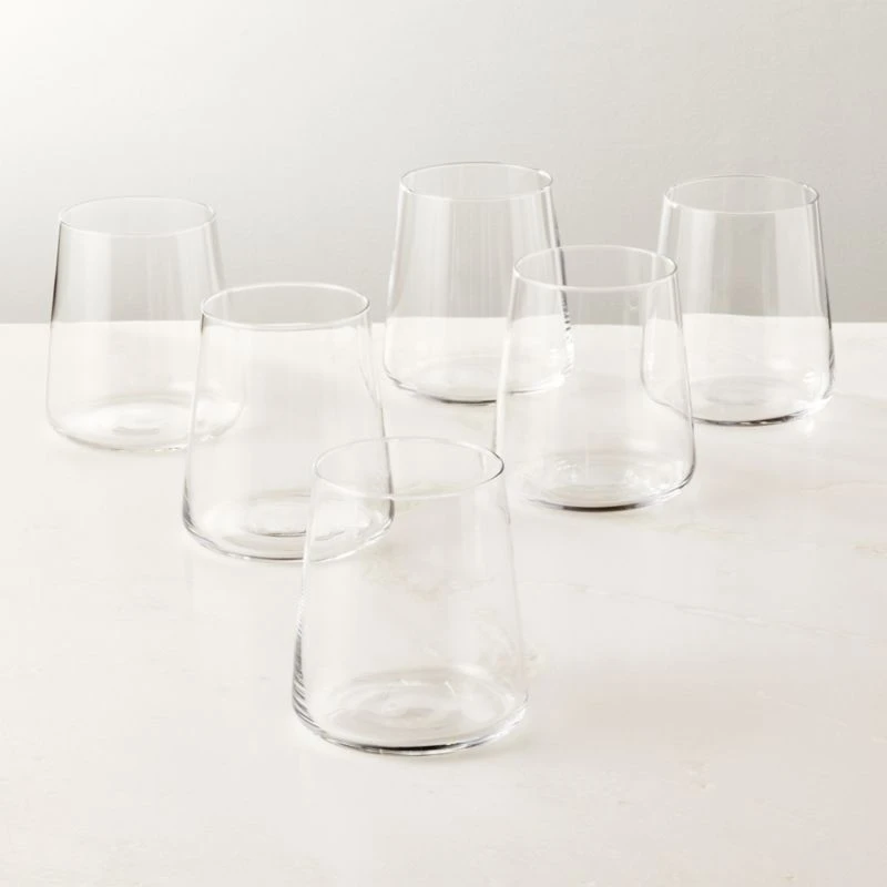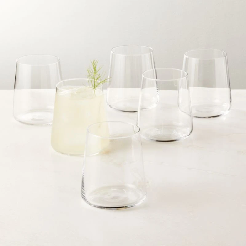 Clear choice for everyday drinkware. Six micro-thin double old-fashioned glasses with subtly tapered shams hold cocktails with stiff simplicity. Pair set with the Neat cooler and tasting glasses. CB2 exclusive.