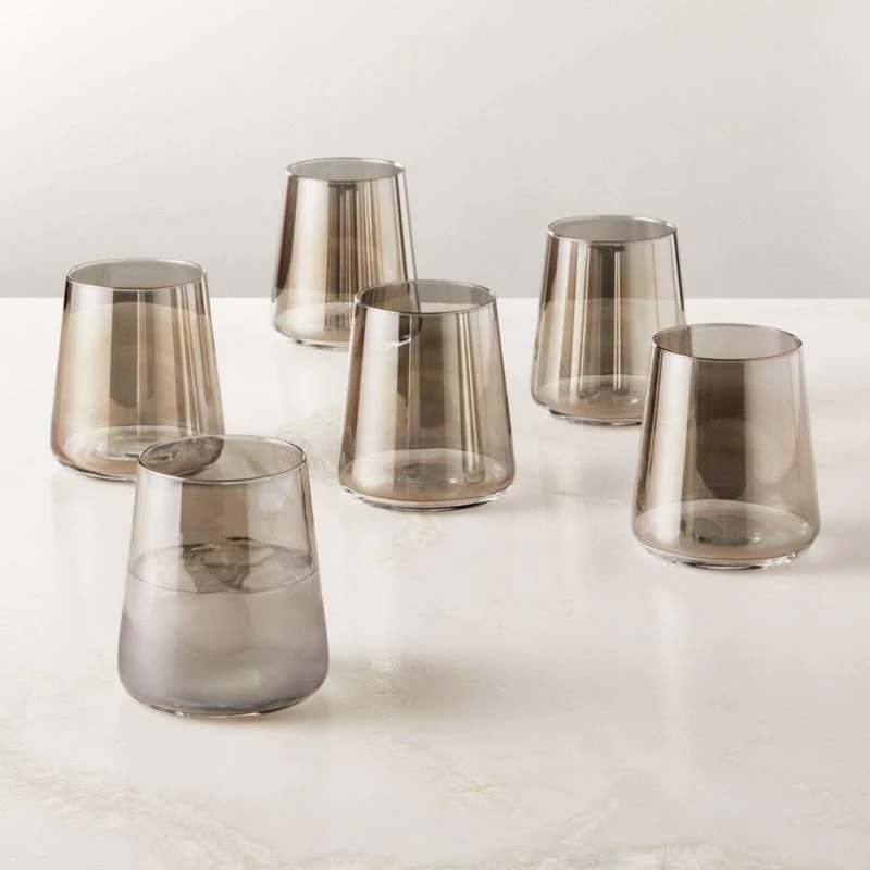 Everyday double old fashioned glass with a smokey grey luster finish holds sips with cool simplicity. Round, micro-thin glass features subtly tapered sham. Pairs with the Neat Smoke Tasting Glass and Cooler. Priced right for multiples. CB2 exclusive.