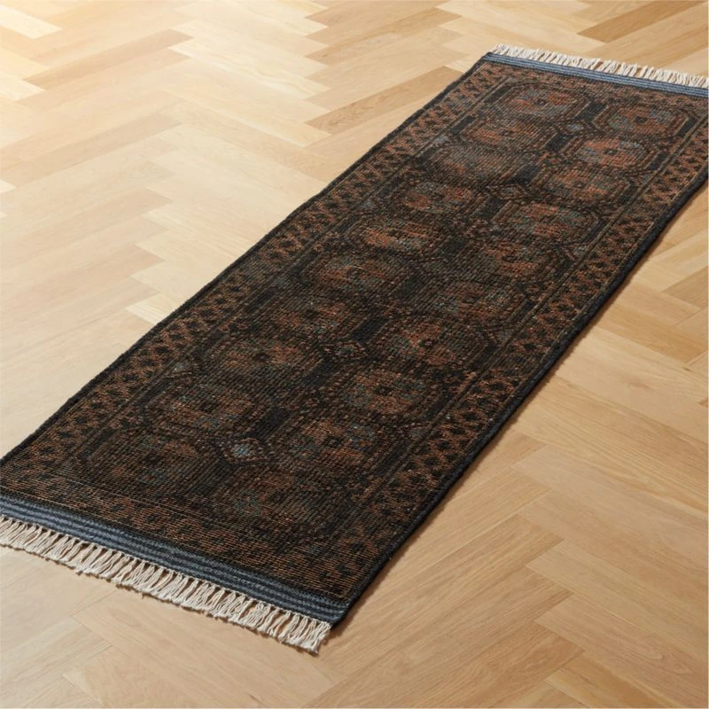 Hand-knotted in India with 18–19 knots per square inch, pure New Zealand wool is sculpted into an intricately detailed design. Distressed by hand for an aged appeal, each runner has its own unique variations in tone. CB2 exclusive.