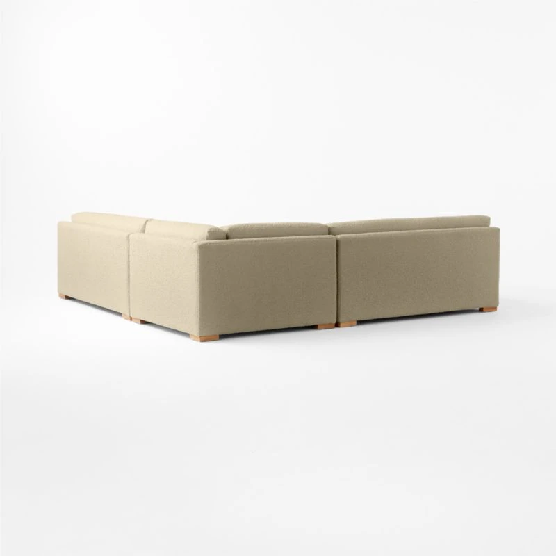 Long, lean, super-deep apartment sectional lounges low on four solid hardwood feet—an elevated update that appreciates high-end craftsmanship and honest materials. Clean silhouette has a plush, pillowed feel thanks to the feather-down cushion design. Soft camel boucle plays well against the contrasting hardwood feet. Sectional pieces can be configured to suit your space. CB2 exclusive.