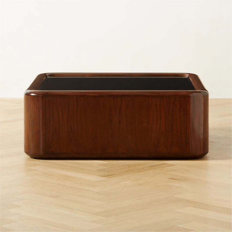 Designed by Ceci Thompson of VUUE, large square coffee table mixes Brazilian modernism with a soupçon of vintage flair. Plank-sawn black walnut sides are French-polished to a high-gloss finish to emphasize the natural beauty of the wood grain. Anchored just beneath the base’s soft radius edge, the black mirrored tabletop gleams with a smoky allure. CB2 exclusive.