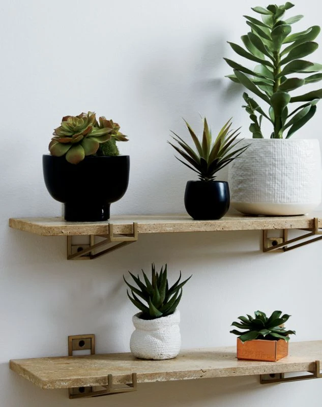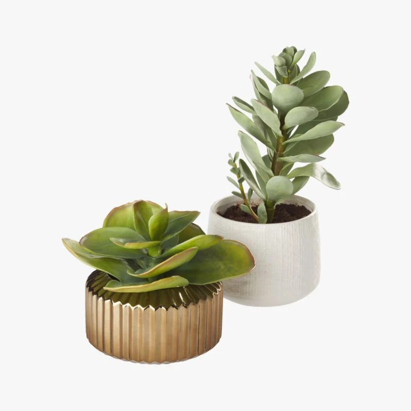 Textured white stoneware vessel pots a forever-green faux succulent. Brings soothing vibe to any environment and requires zero care. CB2 exclusive.