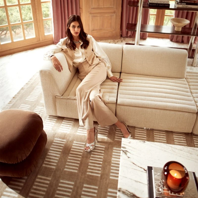 Scaled just right for smaller spaces, sectional sofa by Nicholas Obeid makes the most out of its footprint. Set atop a polished stainless steel plinth base, seat has semi-detached channel-tufted cushion wrapped in a soft, ivory chenille upholstery. It’s an incredibly comfortable sectional sofa in a very of-the-moment fabric. CB2 exclusive.