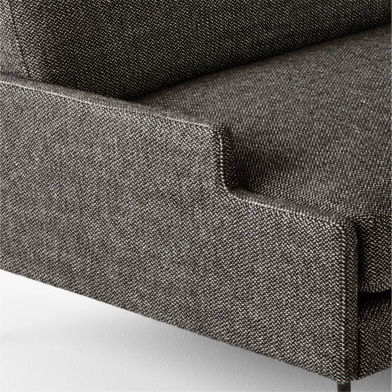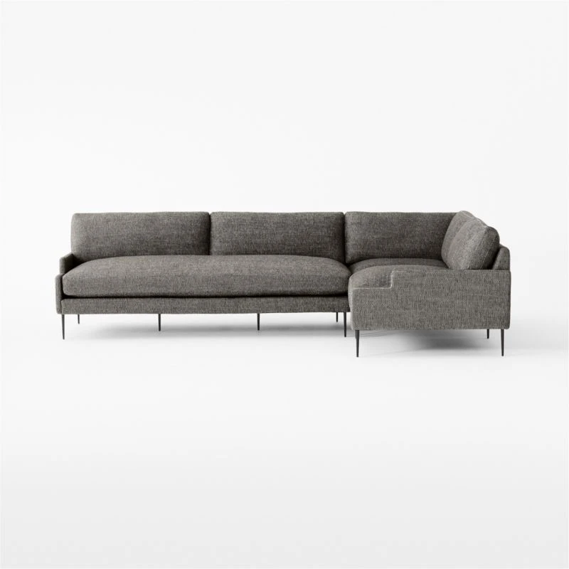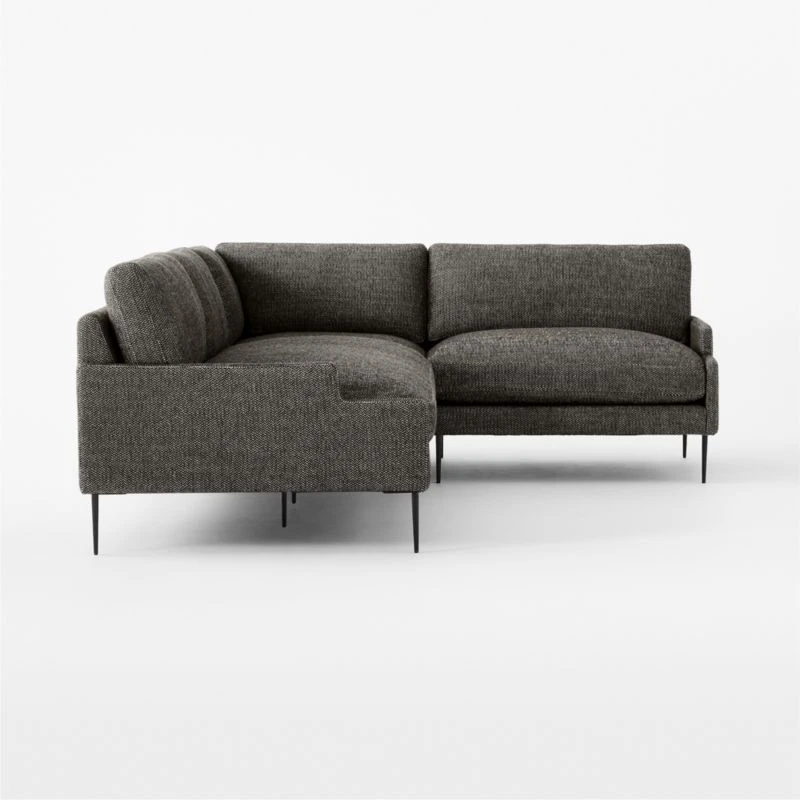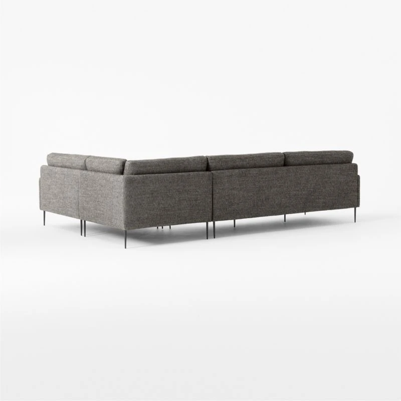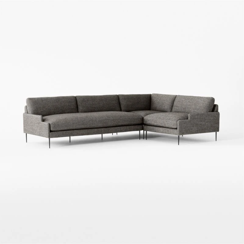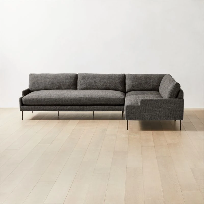 Sectional sofa by Mermelada Estudio feels traditional at first, but upon closer inspection reveals modern sensibilities like thin-profile arms and a sleek silhouette. Tall, needlelike metal legs finished in a lustrous black powdercoat create graphic contrast with grey upholstery. CB2 exclusive.
