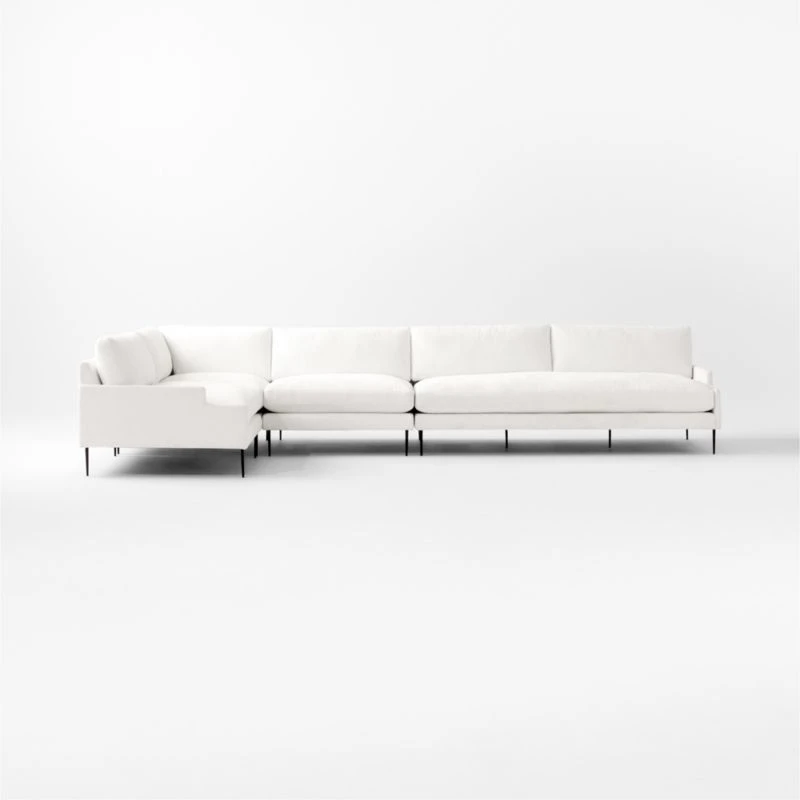 Sectional sofa by Mermelada Estudio feels traditional at first, but upon closer inspection reveals modern sensibilities—like thin-profile arms and a sleek silhouette. Tall, needlelike metal legs finished in a lustrous black powdercoat create graphic contrast with white upholstery. CB2 exclusive.