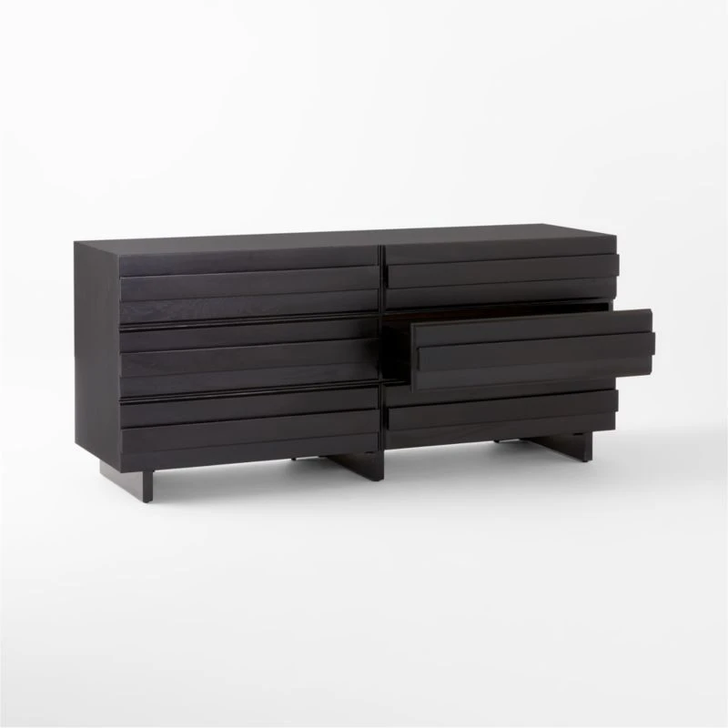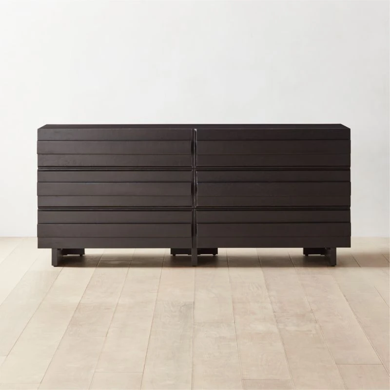 Spacious oak dresser by Lawson-Fenning accentuates the beauty of natural wood. Horizontal ribbons of white oak, certified sustainable by the Forest Stewardship Council ® and given an ebonized black finish, add dimension through naturally occurring whorls inherent to wood. Solid wood drawers have dovetail joint construction and soft-close glides; their wooden handles are incorporated into the drawer fronts for a streamlined look. CB2 exclusive.