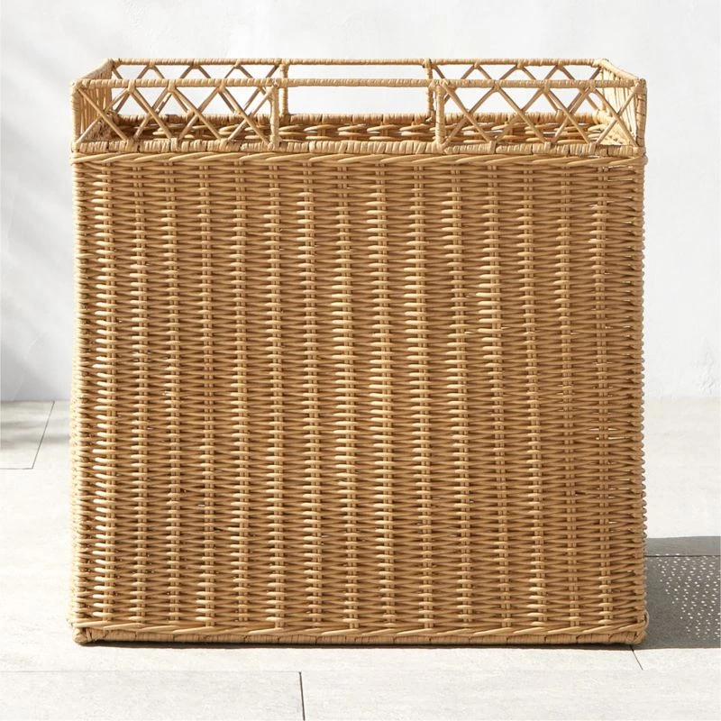 Crafted from natural rattan woven over an iron frame, basket by Ross Cassidy has a classic silhouette and handle smartly incorporated into the design. Simple profile brings a refined sensibility to the porch or patio, offering ample room to store pillows, throws and other outdoor accessories. CB2 exclusive.