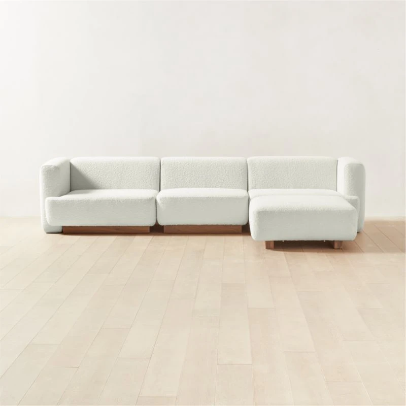 Designed by Lawson-Fenning, the Terrain furniture collection consists of modular pieces that can be arranged to create different environments. Sectional sofa features plush bouclé upholstery. Walnut base, certified sustainable by the Forest Stewardship Council ®, reveals warm tones and striations that vary from piece to piece. Includes left-armed chair, right-armed chair, armless chair and ottoman that come together as one. CB2 exclusive.