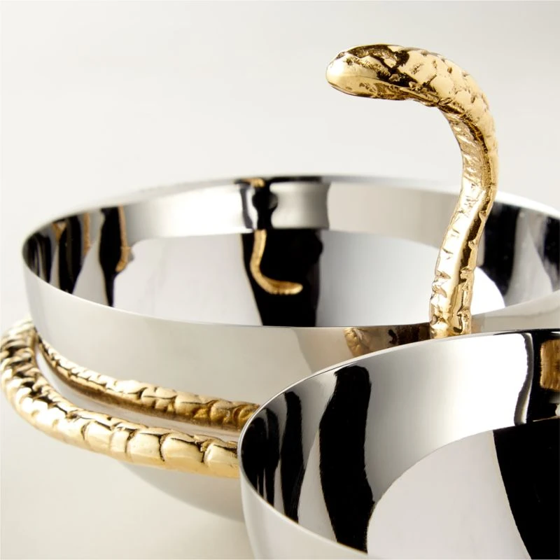 Solid brass snake is entwined around two stainless steel serving bowls for a bit of elevated edginess. Feels like the type of piece you’d find in the bars of your favorite boutique hotel or upscale bar, perfect for peanuts, olives or dips. CB2 exclusive.