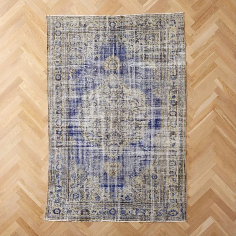 Characterized by a traditional pattern, vintage wool rug is sourced from the Turkish city of Isparta—a major center for weaving during the Ottoman Empire. The highly distressed Oushak design in cobalt blue and tan is finished with fringe. Made of pure wool using a double-knot technique for durability, one-of-a-kind heirloom rug will last for years to come. CB2 exclusive.